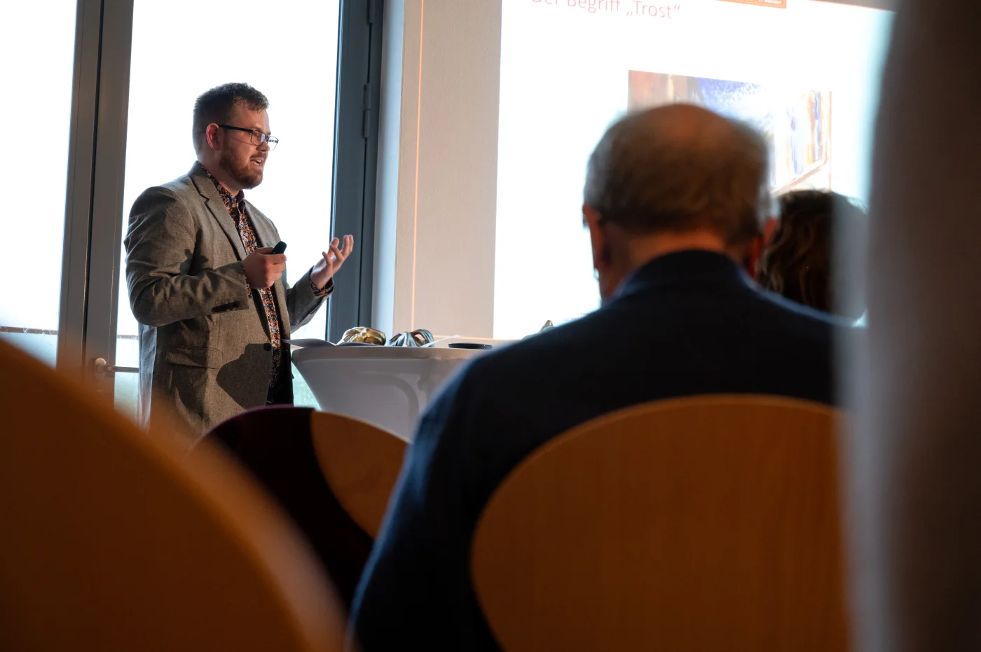 Eröffnet wurde das Symposium von Prof. Dr. Hans-Peter Krüger mit einem Vortrag, der den Titel des Symposiums trug: Persona – Maske – Mensch. Er führte in Plessners philosophische Anthropologie ein, die den Menschen als ein exzentrisches Wesen beschreibt – immer zugleich in sich und außer sich, als Körper und als Person. Echtes Lachen und Weinen erscheinen dabei als anthropologische Grenzphänomene – als Explosion und Implosion des Daseins; Momente, in denen die Grenze zwischen Selbst und Welt aufreißt. Krüger betonte die Notwendigkeit einer dritten Position – einer Instanz, die Vermittlung und Orientierung ermöglicht. Der Mensch, so Plessner, kann sich selbst nur verstehen, wenn er sich von einem Dritten her begreift: als Teil eines Bezugsrahmens, der ihn übersteigt. Damit wurde schon im Eröffnungsvortrag spürbar, dass das Symposium keine theoretische Übung, sondern ein lebendiger Austausch über zutiefst Relationales und Existenzielles war.